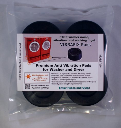 Perfectly sized - not too big or to small to compromise performance.High coefficient of friction - to prevent skidding.Hard rubber (high durometer) - to make machine more stable.Very good vibration absorbing abilities.Premium washing machine anti-vibration pads. Genuine VIBRAFIX pads are one of the best washing machine anti-vibration solutions on the market. You will not be disappointed! If this product does not fix or reduce the vibration issue, maybe it is time for a new washer.This product is made out of special rubber blend that has among the highest coefficient of friction in the rubber family which will prevent any "walking" or skidding of your washer.If "walking" of washer is your main problem we highly recommended purchasing the Super Anchor Liner Discs that will keep the VIBRAFIX pads and your appliances locked in place for good. To purchase Anchor Discs click on ENJ Products, LLC.VIBRAFIX pads are 3 inches in diameter and 1 inch thick. They are black in color and come in set of four. In the middle they have indentation for machine feet. This indentation is universal in size and will work with most size and brands.The pads will also absorb any dryer vibration, so DON'T FORGET to buy an additional set of VIBRAFIX pads for your drier to keep your appliances at the same height. More about this